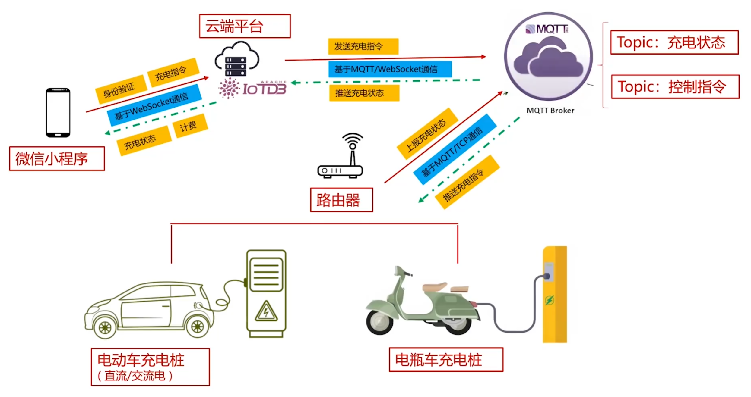1.充电桩包括其他的一些硬件设备,和云服务器通信,首先,都得有个路由器,路由器通过mqtt broker 相当于一个中转站吧和云服务器进行通信。