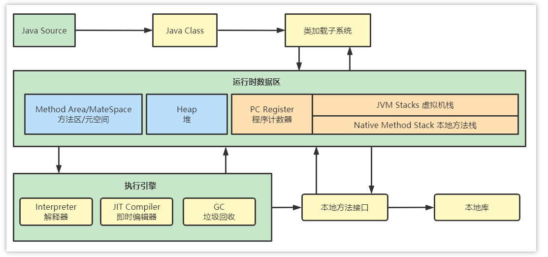 (3)执行引擎(Execution Engine)将字节码翻译为底层系统指令,再交由CPU执行去执行,此时需要调用其他语言的本地库接口(Native Method Library)来实现整个程序的功能。
